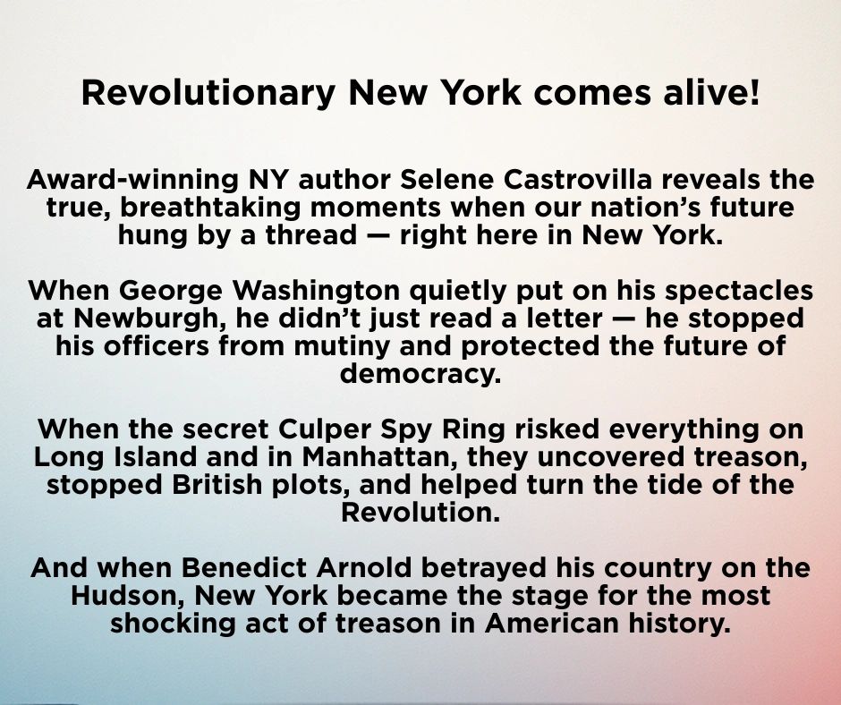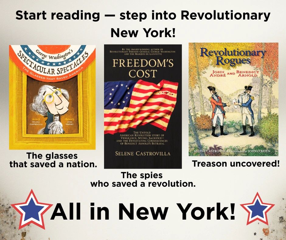 Celebrate revolutionary New York State! Newburgh NY was Washington's final headquarters & the setting for a treasonous plot. Who could imagine that a pair of spectacles could save the day? Native New York author Selene Castrovilla is proud to write Revolutionary War books spotlighting her home state!